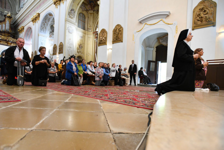 Prezidentka SR Zuzana Čaputová počas slávnostnej svätej omše pri príležitosti Národnej púte k Sedembolestnej Panne Márii, patrónke Slovenska, ktorej sviatok si katolícka cirkev na Slovensku pripomína vždy 15. septembra. Šaštín-Stráže, okr. Senica, 15. september 2023. Foto: SITA/Martin Medňanský.