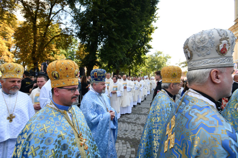 Miništarnti prichádzajú na začiatok slávnostnej svätej omše pri príležitosti Národnej púte k Sedembolestnej Panne Márii, patrónke Slovenska, ktorej sviatok si katolícka cirkev na Slovensku pripomína vždy 15. septembra. Šaštín-Stráže, okr. Senica, 15. september 2023. Foto: SITA/Martin Medňanský.