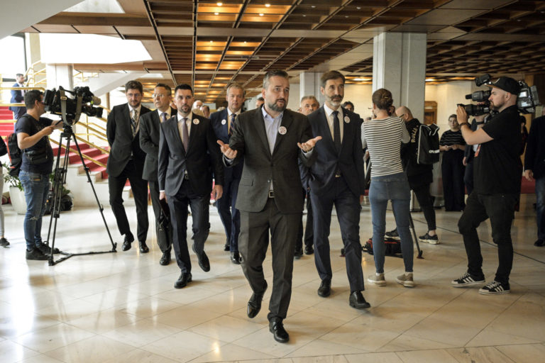 Minister zahraničných vecí a európskych záležitostí Juraj Blanár (v popredí) počas vyhlásenia strany SMER-SD k aktuálnej politickej situácii v rámci rokovania 12. schôdze Národnej rady SR. Bratislava, 21. máj 2024. Foto: SITA/Milan Illík