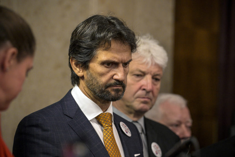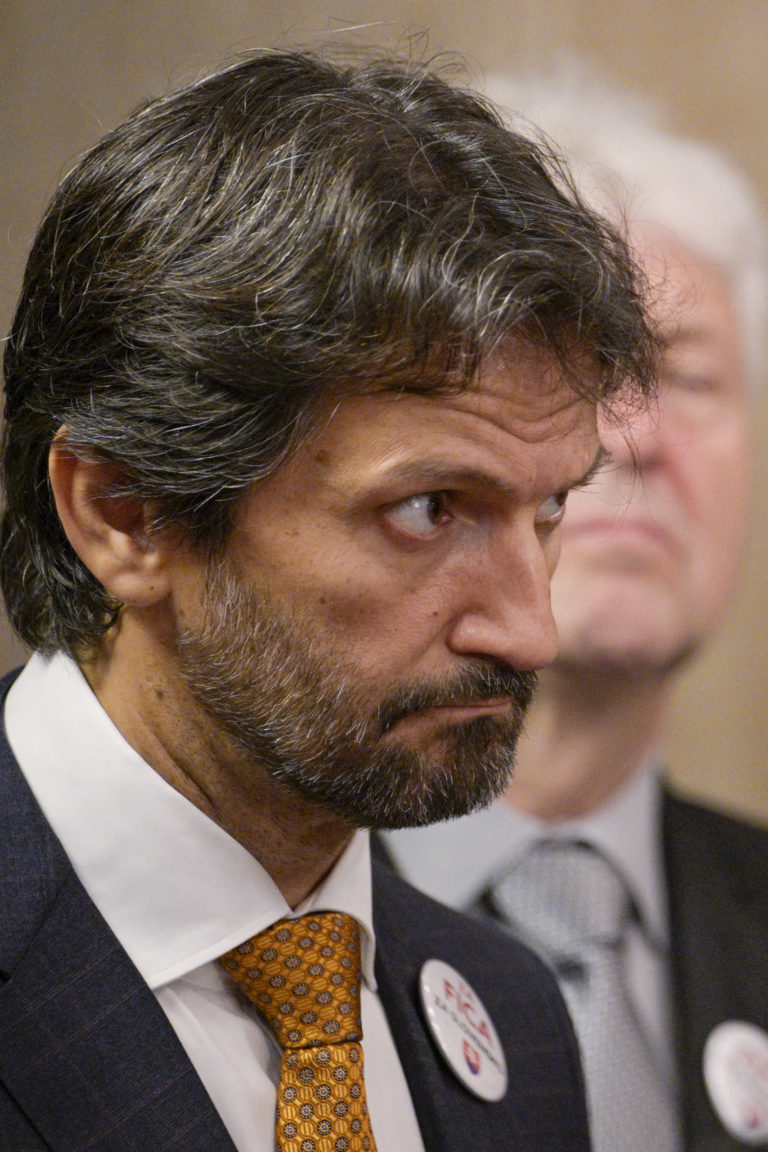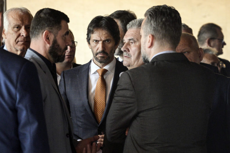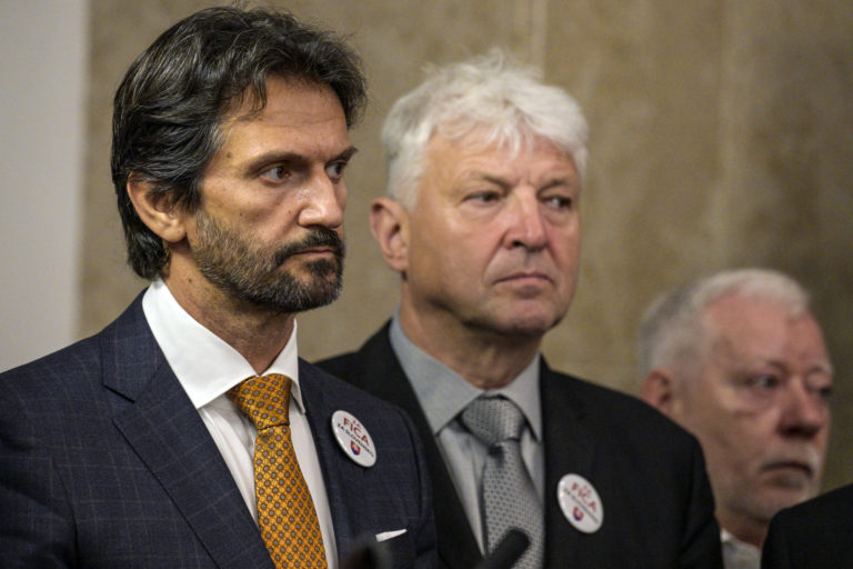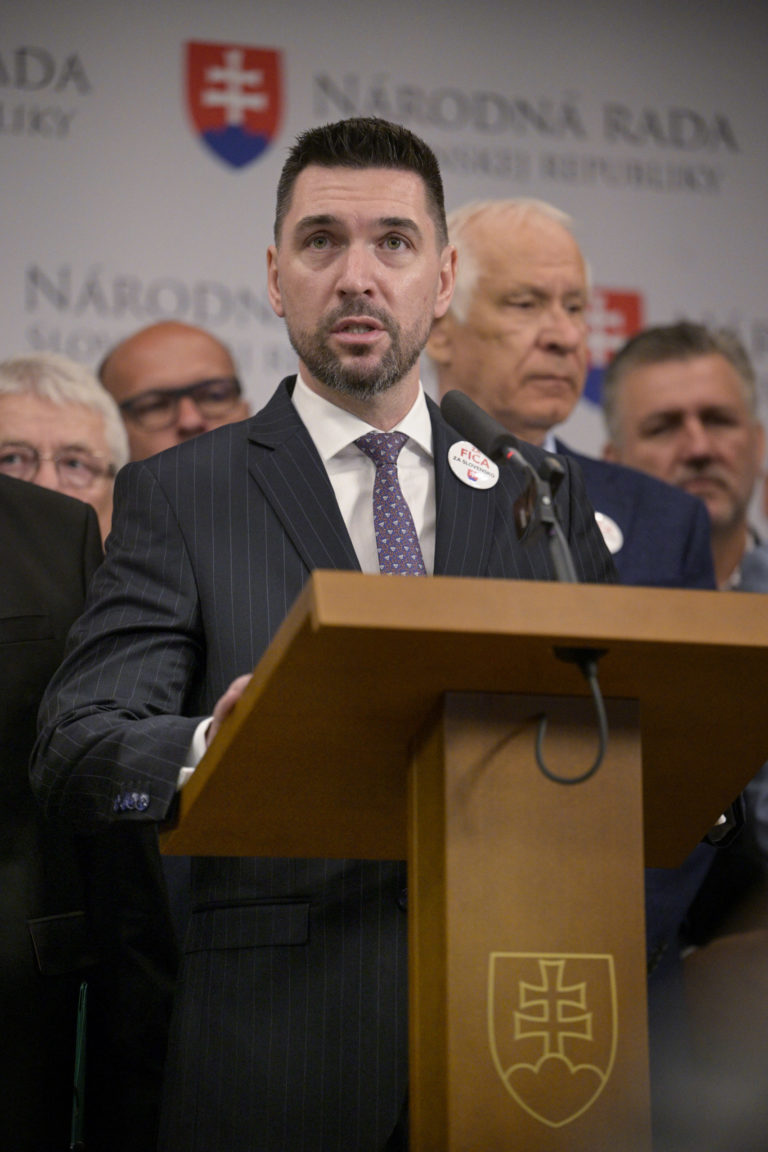 Minister pôdohospodárstva a rozvoja vidieka SR Richard Takáč (v popredí) počas vyhlásenia strany SMER-SD k aktuálnej politickej situácii v rámci rokovania 12. schôdze Národnej rady SR. Bratislava, 21. máj 2024. Foto: SITA/Milan Illík