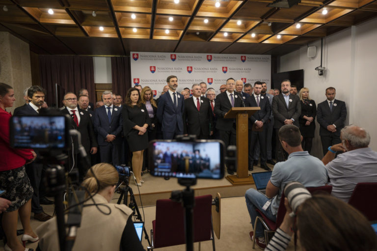 Minister financií SR Ladislav Kamenický (v popredí uprostred) počas vyhlásenia strany SMER-SD k aktuálnej politickej situácii v rámci rokovania 12. schôdze Národnej rady SR. Bratislava, 21. máj 2024. Foto: SITA/Milan Illík