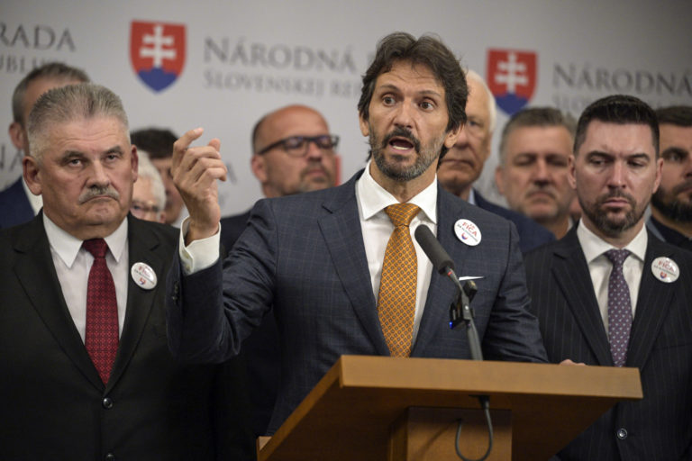 Podpredseda NR SR za stranu SMER-SD Ľuboš Blaha (uprostred v popredí) počas vyhlásenia strany SMER-SD k aktuálnej politickej situácii v rámci rokovania 12. schôdze Národnej rady SR. Bratislava, 21. máj 2024. Foto: SITA/Milan Illík.