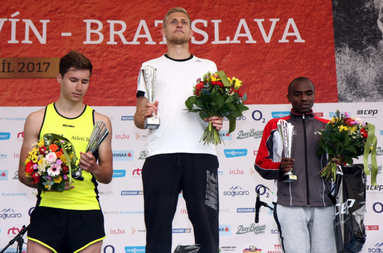 Víťazi v kategórii mužov, zľava: Matúš Verbovský zo Slovenska na 3. mieste, László Gregor z Maďarska na 1. mieste a Joel Maina Mwangi z Kene na 2. mieste 70. ročníka Národného behu Devín - Bratislava. Bratislava, 9. apríl 2017. Foto: SITA/Peter Maďar