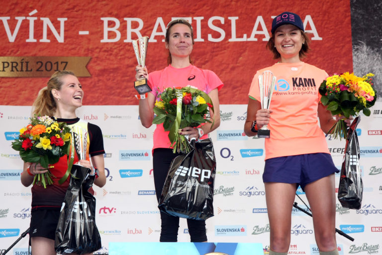 Víťazky v kategórii žien, zľava: Lucia Kovalančíková zo Slovenska na 3. mieste, Zita Kácser z Maďarska na 1. mieste a Nikola Čorbová zo Slovenska na 2. mieste 70. ročníka Národného behu Devín - Bratislava. Bratislava, 9. apríl 2017. Foto: SITA/Peter Maďar