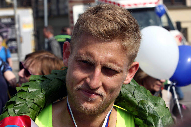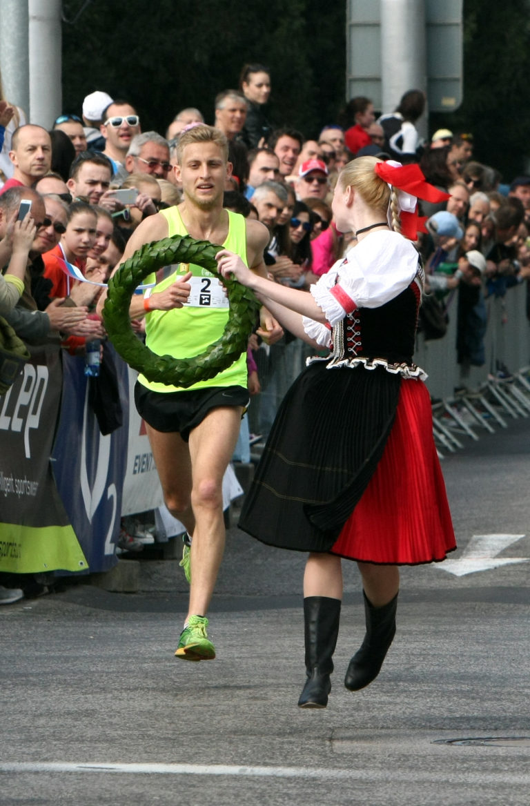 Víťaz László Gregor z Maďarska s vencom počas 70. ročníka Národného behu Devín - Bratislava. Bratislava, 9. apríl 2017. Foto: SITA/Peter Maďar