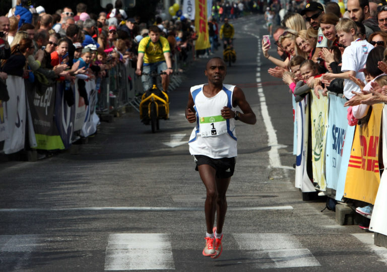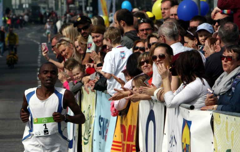 Druhý v kategórii mužov Joel Maina Mwangi (vľavo) z Kene v cieli 70. ročníka Národného behu Devín - Bratislava. Bratislava, 9. apríl 2017. Foto: SITA/Peter Maďar