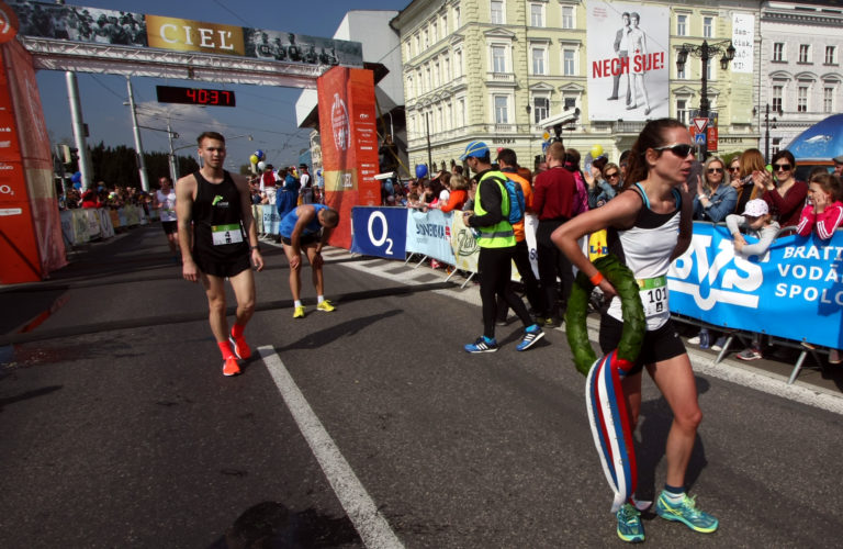 Bežci dobiehajú do cieľa 70. ročníka Národného behu Devín - Bratislava. Bratislava, 9. apríl 2017. Foto: SITA/Peter Maďar
