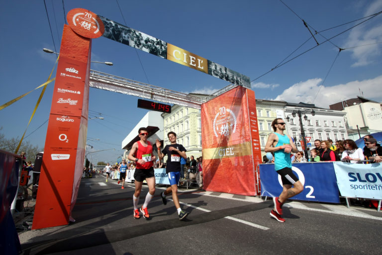Víťaz László Gregor (uprostred vľavo) z Maďarska v cieli 70. ročníka Národného behu Devín - Bratislava. Bratislava, 9. apríl 2017. Foto: SITA/Peter Maďar