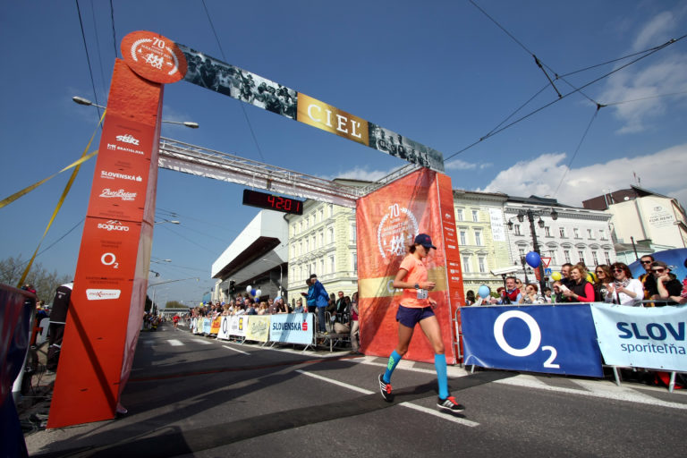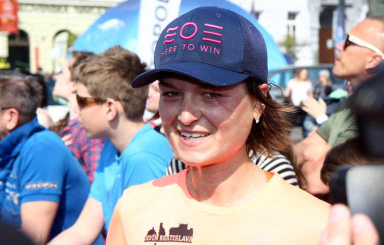 Druhá v kategórii žien Slovenka Nikola Čorbová v cieli 70. ročníka Národného behu Devín - Bratislava. Bratislava, 9. apríl 2017. Foto: SITA/Peter Maďar