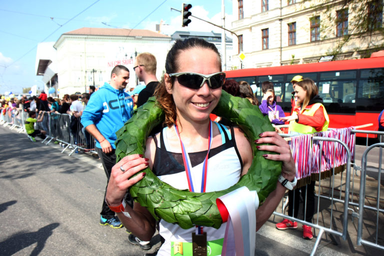 Víťazka v kategórii žien Zita Kácserová z Maďarska s vencom počas 70. ročníka Národného behu Devín - Bratislava. Bratislava, 9. apríl 2017.