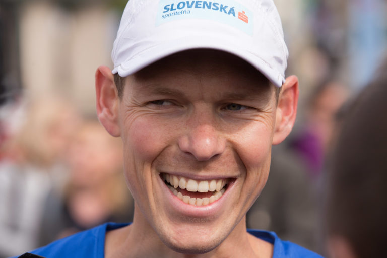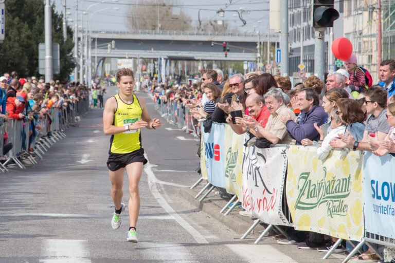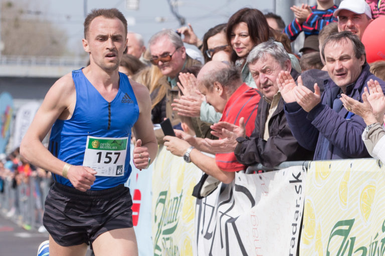 Matej Tóth v cieli 71. ročníka Národného behu Devín - Bratislava. Bratislava, 15. apríl 2018. Foto: SITA/Braňo Bibel.