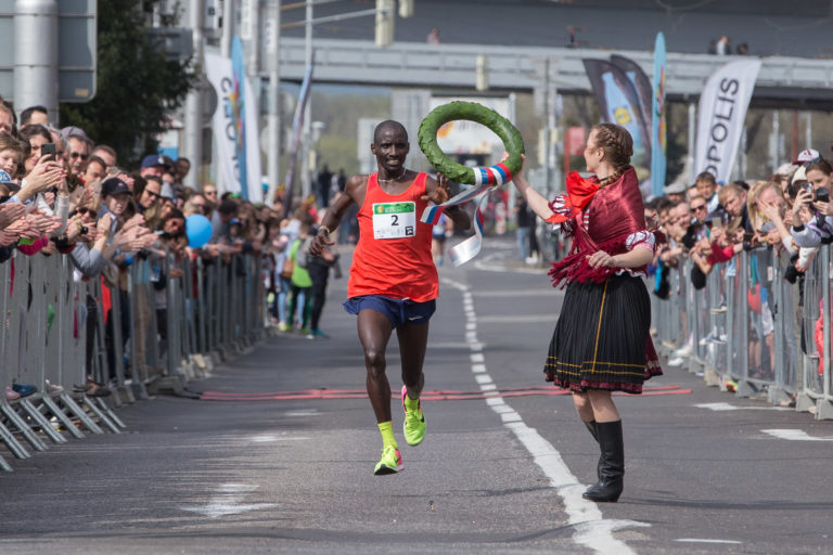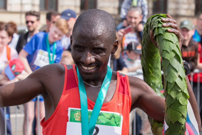 Nelson Cherutich dobieha do cieľa ako prvý počas 71. ročníka Národného behu Devín - Bratislava. Bratislava, 15. apríl 2018. Foto: SITA/Braňo Bibel.