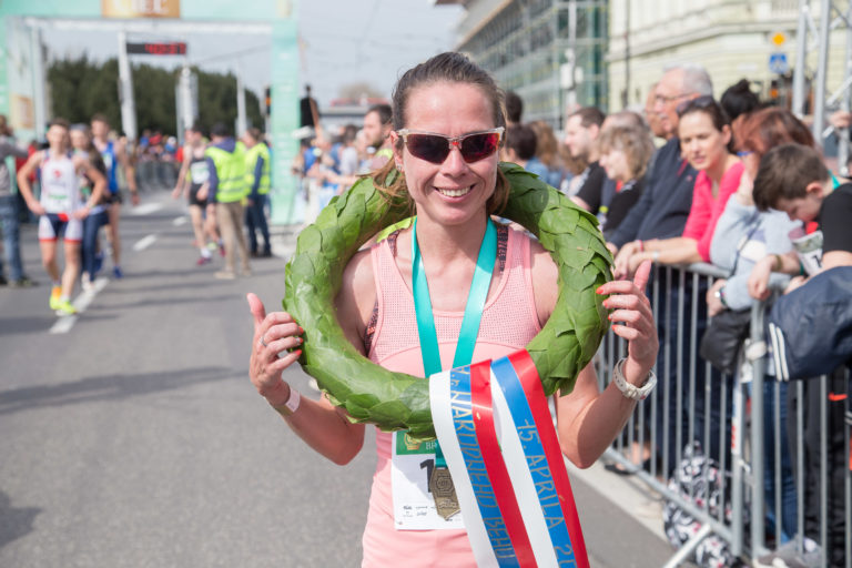 Zita Kácser po dobehnutí do cieľa ako prvá žena počas 71. ročníka Národného behu Devín - Bratislava. Bratislava, 15. apríl 2018. Foto: SITA/Braňo Bibel.