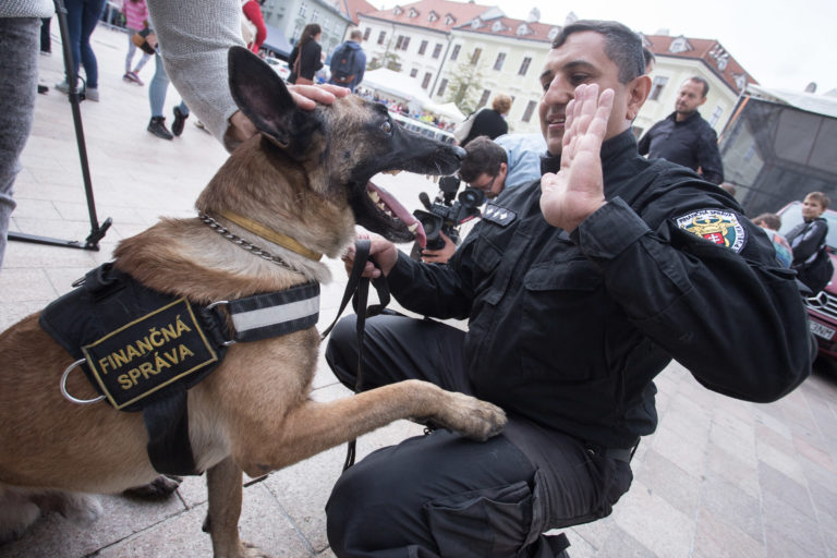 Cvičený pes finančnej správy a príslušník finančnej správy počas Národného dňa colníkov na Hlavnom námestí. Bratislava, 22. september 2018. Foto: SITA/Braňo Bibel