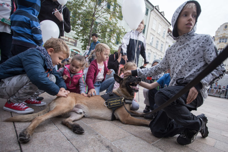 Deti a služobný pes finančnej správy počas Národného dňa colníkov na Hlavnom námestí. Bratislava, 22. september 2018. Foto: SITA/Braňo Bibel