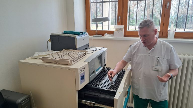 Laboratórny diagnostik Igor Porvaznik v Národnom ústave tuberkulózy, pľúcnych chorôb a hrudníkovej chirurgie vo Vyšných Hágoch ukazuje prístroj na vyšetrenie vzoriek spút na tuberkulózu. Vyšné Hágy, 21. marec 2024. Foto: SITA/Mária Frisová