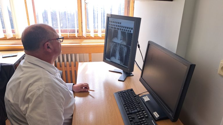 Námestník Národného ústavu tuberkulózy, pľúcnych chorôb a hrudníkovej chirurgie vo Vyšných Hágoch a prezident Slovenskej pneumologickej a ftizeologickej spoločnosti SLS Ivan Solovič počas práce so snímkami pľúc postihnutých tuberkulózou. Vyšné Hágy, 21. marec 2024. Foto: SITA/Mária Frisová