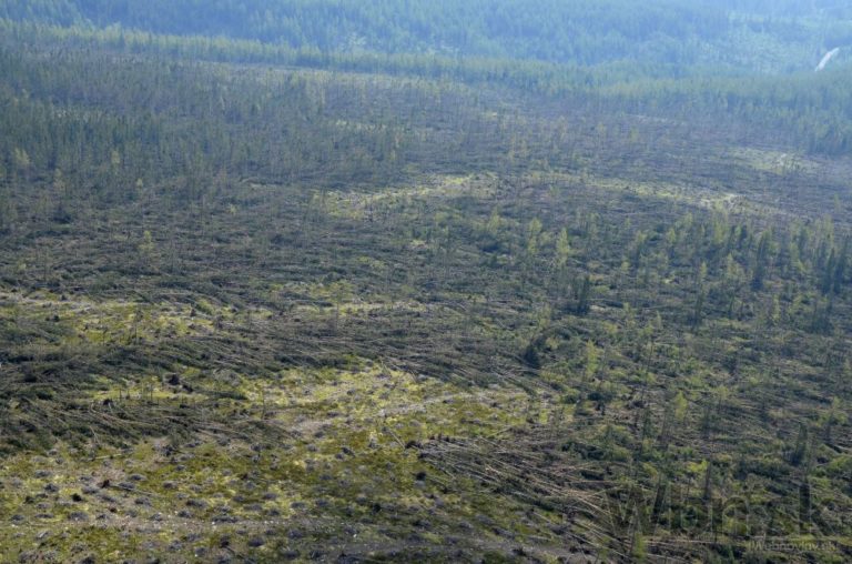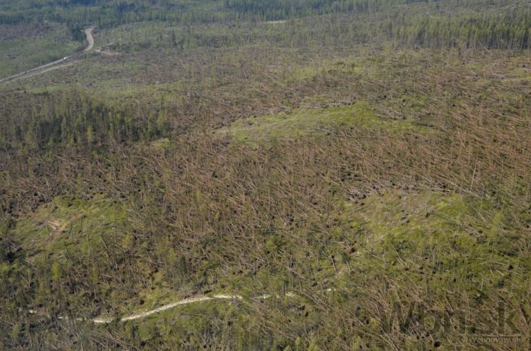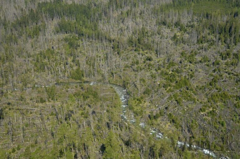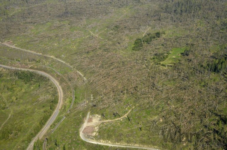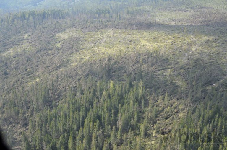 Pohľad na následky veternej smršte vo Vysokých Tatrách počas letu vrtuľníkom za účasti ministra životného prostredia a ministra pôdohospodárstva a rozvoja vidieka. Foto: SITA/Radoslav Maťaš