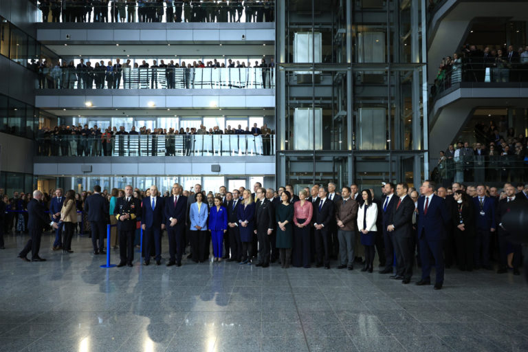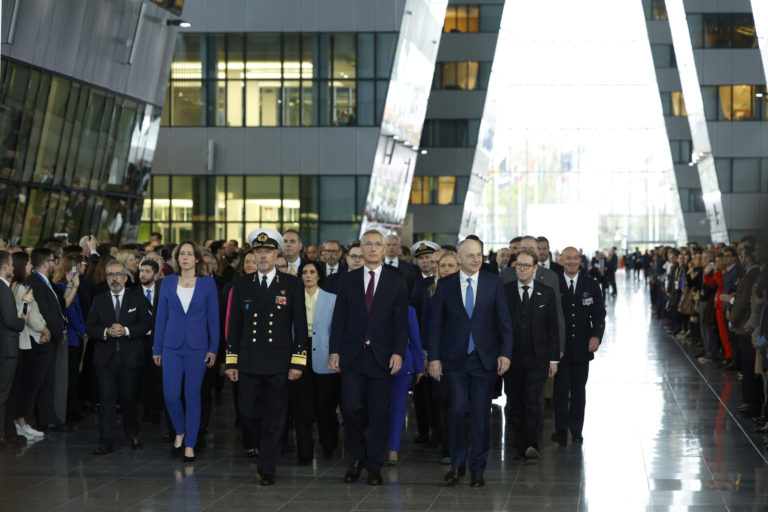 Organizácia Severoatlantickej zmluvy (NATO) oslavuje 75. výročie svojho vzniku. Menšia oslava podpísania Washingtonskej zmluvy sa konala v Bruseli, kde sa od stredy stretávajú ministri zahraničia členských štátov. Foto: SITA/AP.