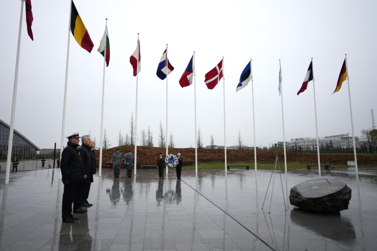 Generálny tajomník NATO Jens Stoltenberg (uprostred vľavo) s predsedom Vojenského výboru NATO admirálom Robom Bauerom a zástupcom generálneho tajomníka NATO Mirceom Geoanom počas slávnostného kladenia vencov v sídle NATO v Bruseli. Organizácia Severoatlantickej zmluvy oslavuje 75. výročie svojho vzniku. Foto: SITA/AP.