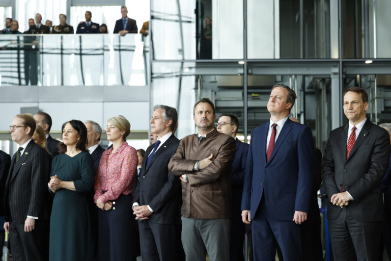 Zľava ministri zahraničných vecí: Tobias Billstrom (Švédsko), Annalena Baerbock (Nemecko), Melanie Joly (Kanada), Antony Blinken (USA), Xavier Bettel (Luxembursko), David Cameron (Veľká Británia) a Radoslaw Sikorski (Poľsko) počas ceremónie pri príležitosti 75. výročia vzniku NATO. Foto: SITA/AP.