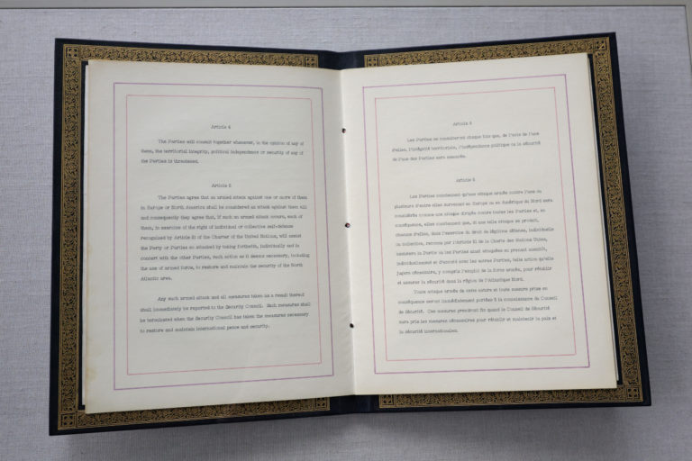 Organizácia Severoatlantickej zmluvy (NATO) oslavuje 75. výročie svojho vzniku. Pri tejto príležitosti doviezli z USA do Bruselu Washingtonskú zmluvu. Foto: SITA/AP.