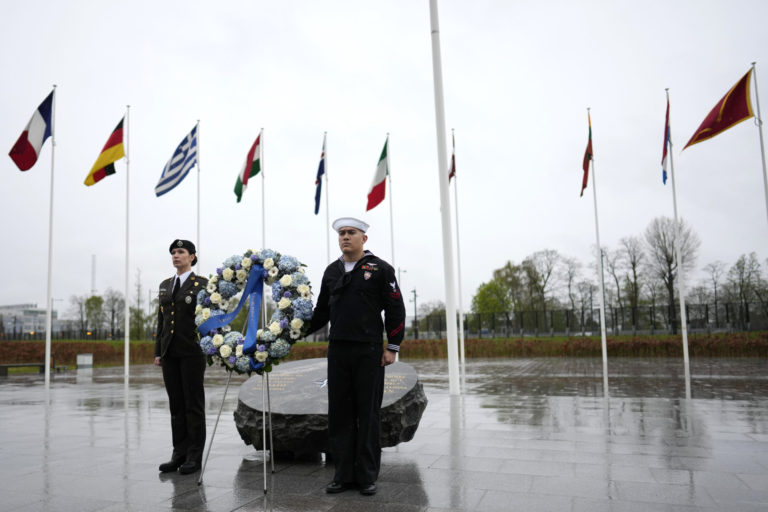 Dvaja vojaci stoja pod vlajkami členov aliancie NATO počas slávnostného kladenia vencov v sídle NATO v Bruseli. Organizácia Severoatlantickej zmluvy oslavuje 75. výročie svojho vzniku. Foto: SITA/AP.