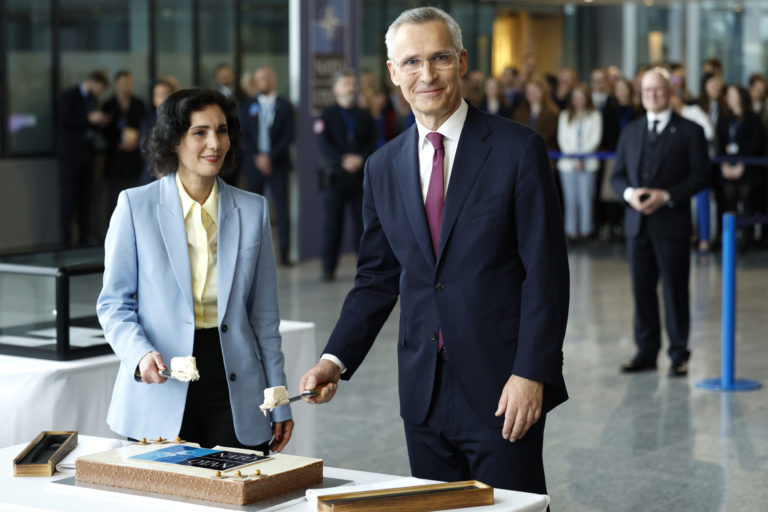 Generálny tajomník NATO Jens Stoltenberg (vpravo) a belgická ministerka zahraničných vecí Hadja Lahbib krájali tortu počas ceremónie pri príležitosti 75. výročia NATO v sídle NATO v Bruseli. Foto: SITA/AP.