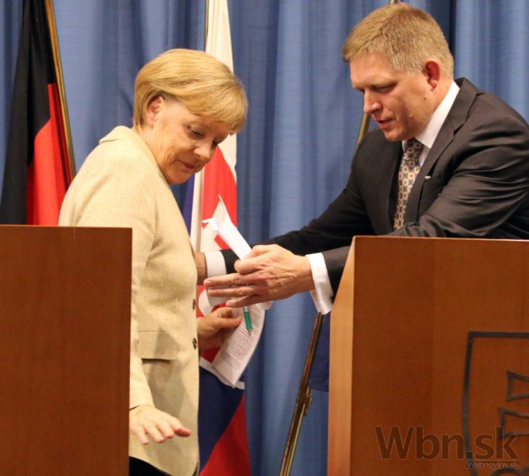 Predseda vlády SR Robert Fico a kancelárka Spolkovej republiky Nemecko Angela Merkelová počas prijatia predsedom vlády SR. Merkelová si prišla na Slovensko prevziať čestný titul UK Doctor honoris causa. Bratislava, 20. október 2014. Foto: SITA/Jozef Jakubčo