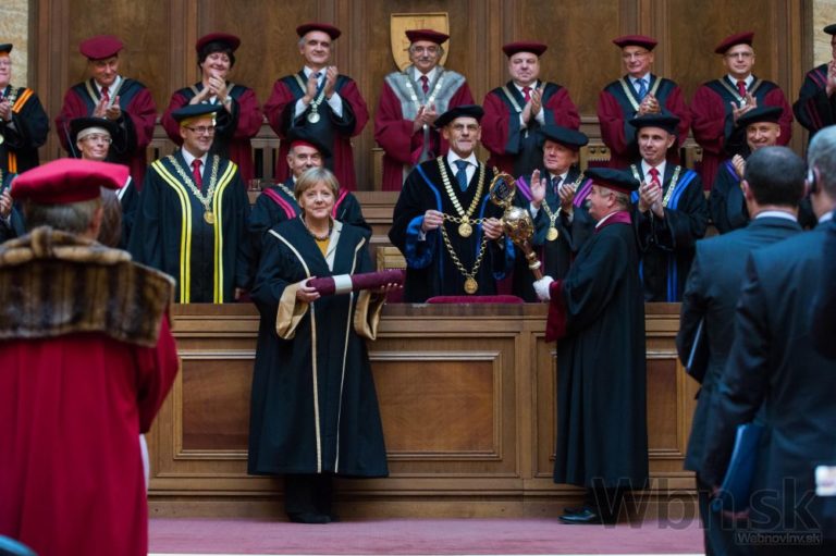 Kancelárka Spolkovej republiky Nemecko Angela Merkelová (vľavo uprostred) počas prijatia čestného titulu Univerzity Komenského Doctor honoris causa pri príležitosti slávnostného zasadnutie Vedeckej rady UK. Bratislava, 20. október 2014. Foto: SITA/Jozef Jakubčo
