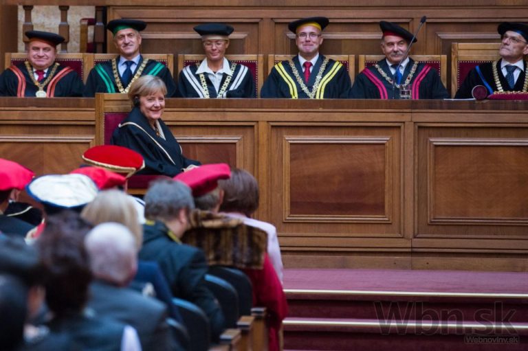 Kancelárka Spolkovej republiky Nemecko Angela Merkelová počas prijatia čestného titulu Univerzity Komenského Doctor honoris causa pri príležitosti slávnostného zasadnutie Vedeckej rady UK. Bratislava, 20. október 2014. Foto: SITA/Jozef Jakubčo