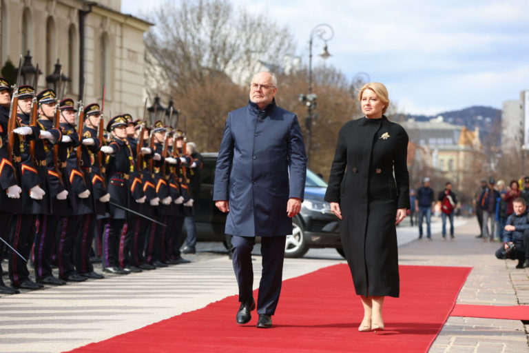 Zľava: Prezidentka SR Zuzana Čaputová a primátor Košíc Jaroslav Polaček počas privítacieho ceremoniálu pred Starou radnicou v Košiciach pri príležitosti oficiálnej návštevy prezidenta Estónska na Slovensku. Košice, 28. marec 2023. Foto: SITA/Marek Lukáč
