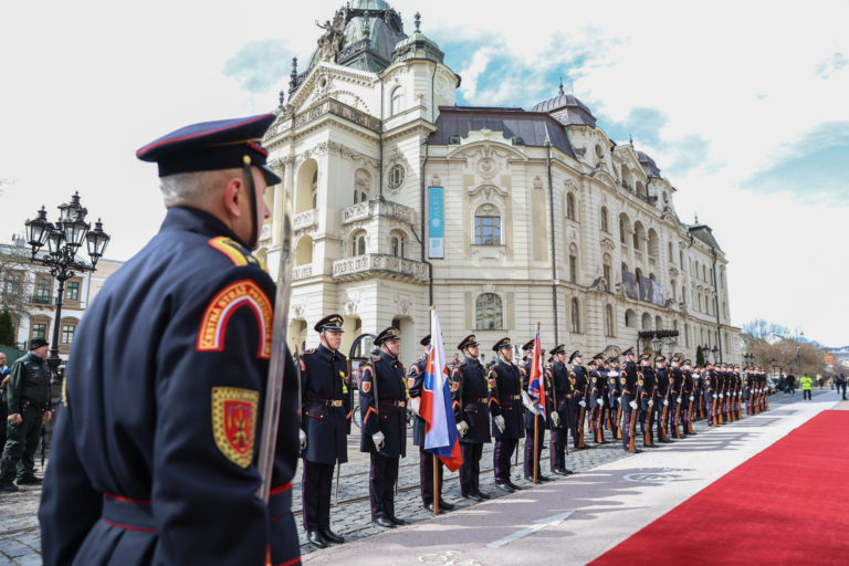 Čestná stráž počas privítacieho ceremoniálu pred Starou radnicou v Košiciach pri príležitosti oficiálnej návštevy prezidenta Estónska na Slovensku. Košice, 28. marec 2023. Foto: SITA/Marek Lukáč
