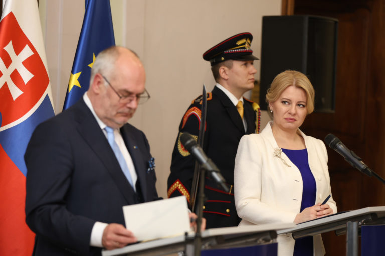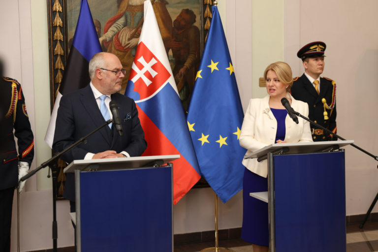 Zľava: Prezidentka SR Zuzana Čaputová počas tlačovej besedy v rámci oficiálnej návštevy prezidenta Estónska na Slovensku. Košice, 28. marec 2023. Foto: SITA/Marek Lukáč