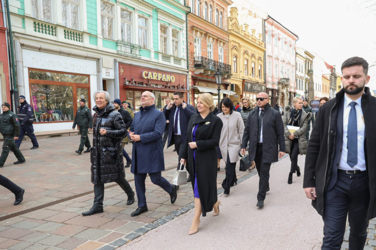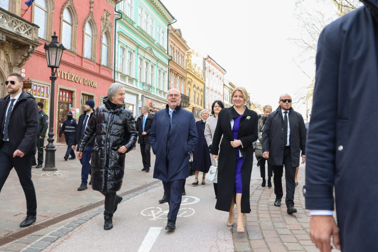 Prezidentka SR Zuzana Čaputová (druhá sprava) a estónsky prezident Alar Karis (tretí sprava) počas prechádzky centrom Košíc pri príležitosti oficiálnej návštevy prezidenta Estónska na Slovensku. Košice, 28. marec 2023. Foto: SITA/Marek Lukáč
