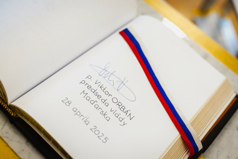Podpis premiéra Maďaska v knihe návštev počas jeho prijatia prezidentom SR v Prezidentskom paláci v rámci oficiálnej návštevy predsedu vlády Maďarska na Slovensku. Bratislava, 28. apríl 2025. Foto: SITA/Kancelária prezidenta SR