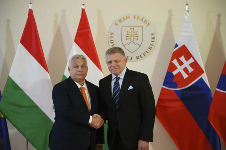 Slovenský premiér Robert Fico (vľavo) privítal v Bratislave maďarského premiéra Viktora Orbána. Foto: SITA/AP
