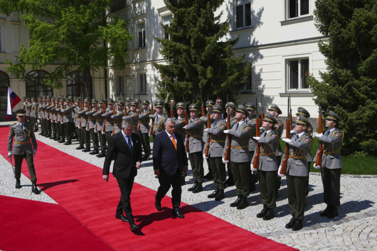 Uprostred sprava: Prezident SR Peter Pellegrini a predseda vlády Maďarska Viktor Orbán počas prijatia v Prezidentskom paláci v rámci oficiálnej návštevy predsedu vlády Maďarska na Slovensku. Bratislava, 28. apríl 2025. Foto: SITA/Kancelária prezidenta SR