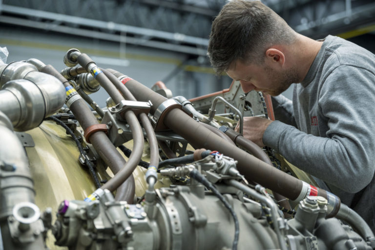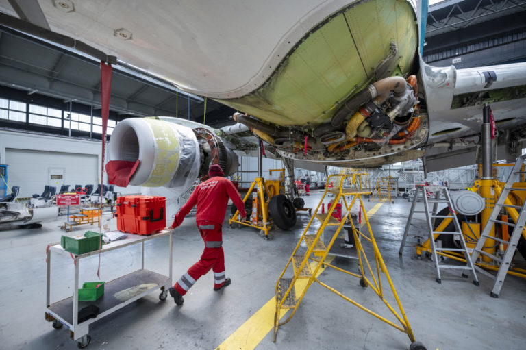 Oprava lietadiel v hangári letiska počas prehliadky priestorov Letiska M. R. Štefánika v Bratislave za účasti ministra dopravy a generálneho riaditeľa Letiska Bratislava, po ktorej informovali o pripravenosti bratislavského letiska na letnú sezónu. Bratislava, 26. apríl 2024. Foto: SITA/Milan Illík
