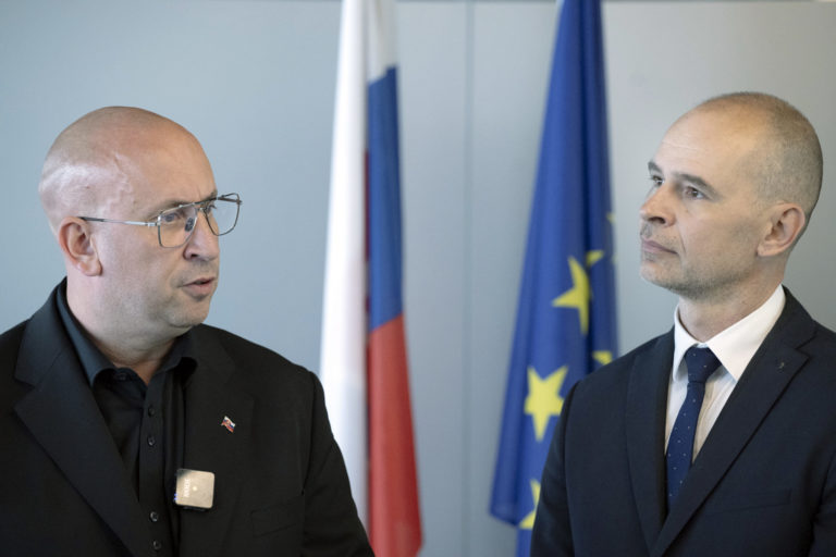 Zľava: Minister dopravy Jozef Ráž a generálny riaditeľ Letiska M. R. Štefánika Dušan Novota počas brífingu, na ktorom informovali o pripravenosti bratislavského letiska na letnú sezónu. Bratislava, 26. apríl 2024. Foto: SITA/Milan Illík
