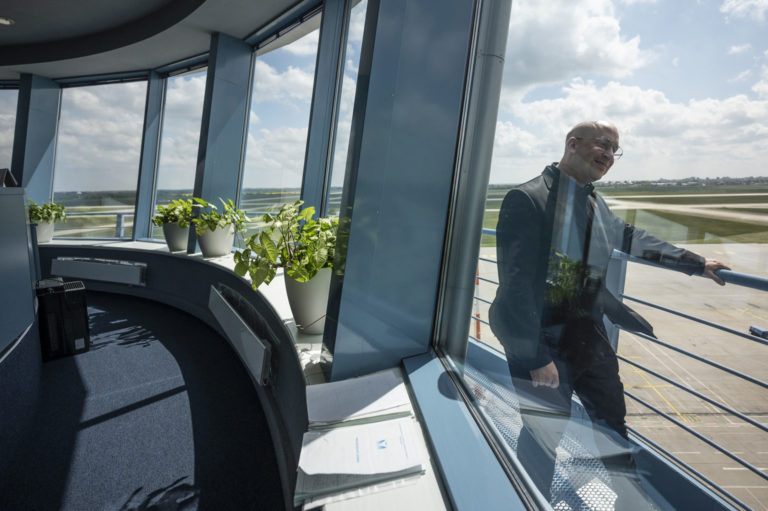 Minister dopravy Jozef Ráž v riadiacej veži počas prehliadky priestorov Letiska M. R. Štefánika za účasti generálneho riaditeľa letiska, po ktorej informovali o pripravenosti bratislavského letiska na letnú sezónu. Bratislava, 26. apríl 2024. Foto: SITA/Milan Illík