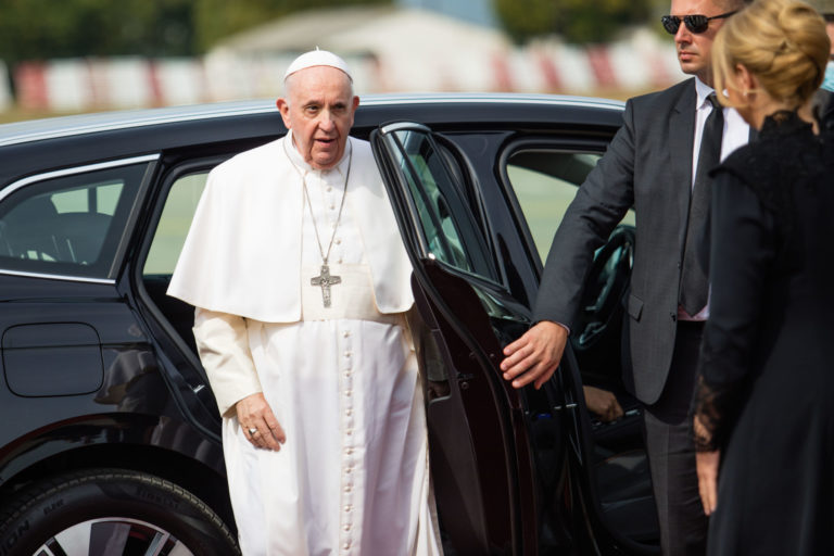 Pápež František počas príchodu na jeho súkromnú návštevu bratislavského Centra Betlehem. Bratislava, 13. september 2021. Foto: SITA/Alexandra Čunderlíková