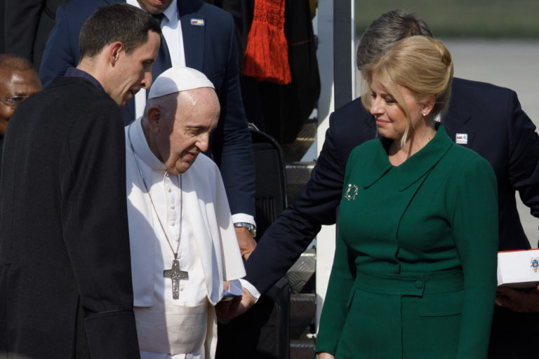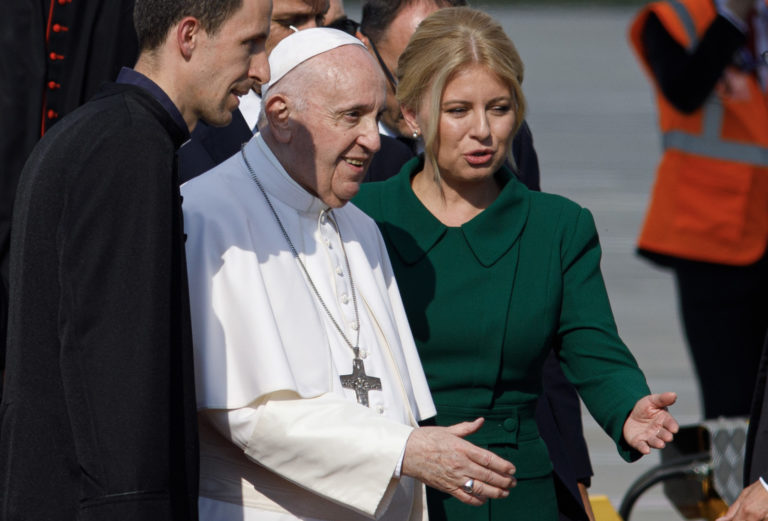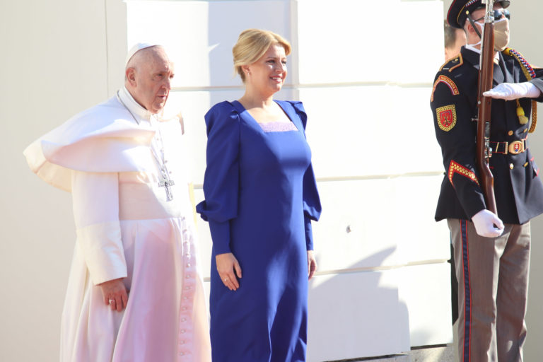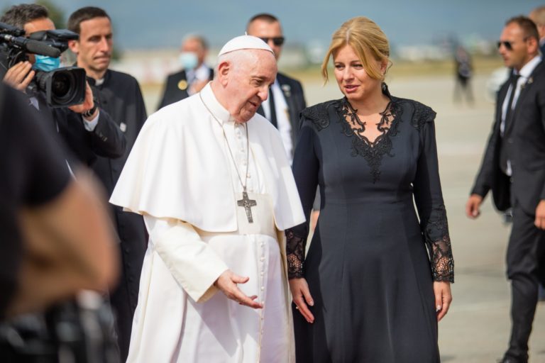 V pozadí prezidentka SR Zuzana Čaputová a pápež František počas oficiálneho prijatia pápeža na bratislavskom letisku. Bratislava, 12. september 2021. Foto: SITA/AP/Petr David Josek