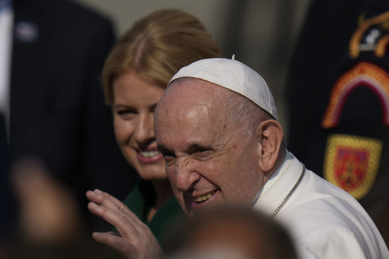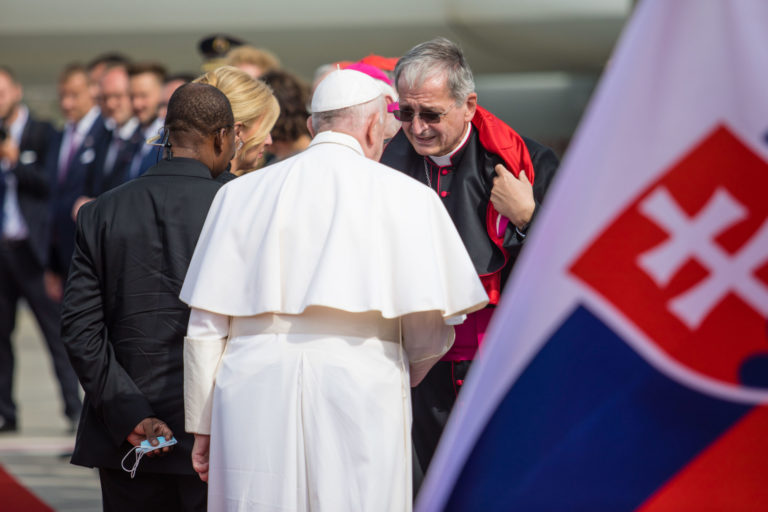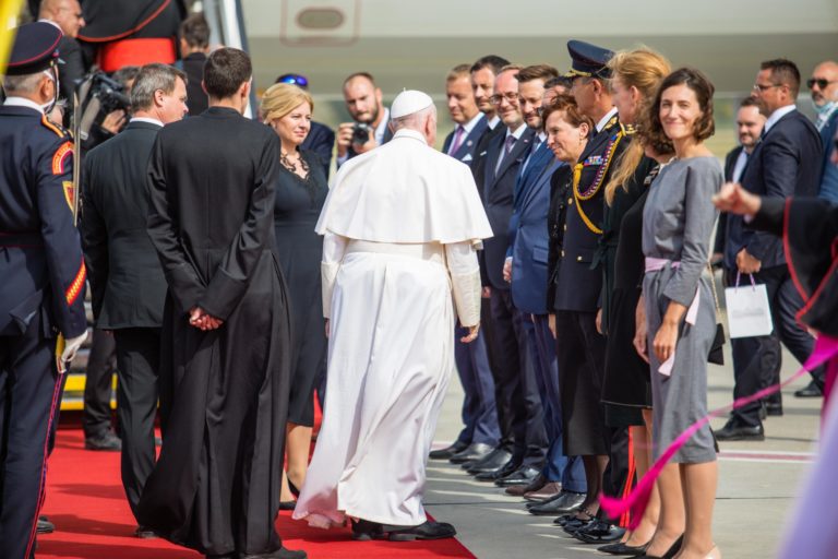 Pápež František počas oficiálneho prijatia pápeža na bratislavskom letisku. Bratislava, 12. september 2021. Foto: SITA/AP/Petr David Josek