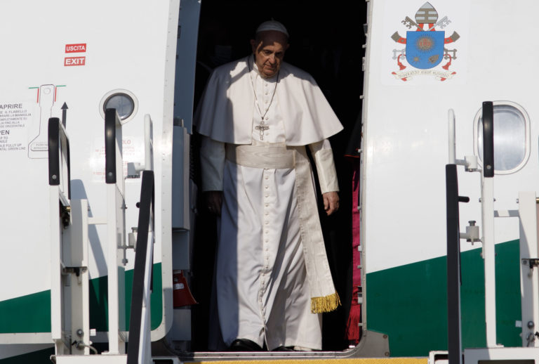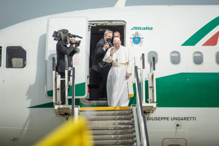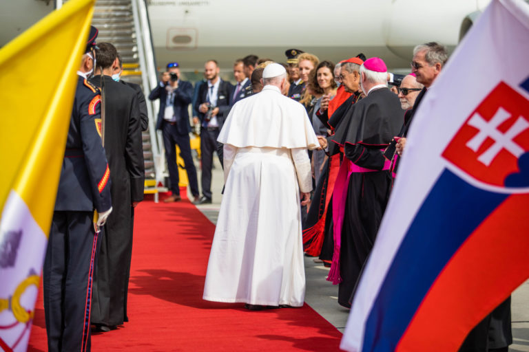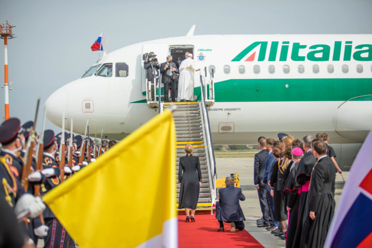 Pápež František vystupuje z lietadla po pristáti na bratislavskom letisku. Bratislava, 12. september 2021. Foto: SITA/Branislav Bibel