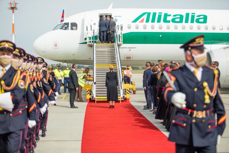 Prezidentka SR Zuzana Čaputová počas rozlúčkového ceremoniálu na bratislavskom letisku pred odletom Svätého Otca zo Slovenska. Bratislava, 15. september 2021. Foto: SITA/Jana Birošová