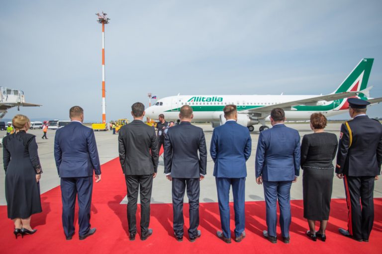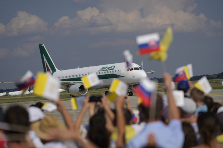 Lietadlo s pápežom Františkom počas rozlúčkového ceremoniálu na bratislavskom letisku pred odletom Svätého Otca zo Slovenska. Bratislava, 15. september 2021. Foto: SITA/Jana Birošová