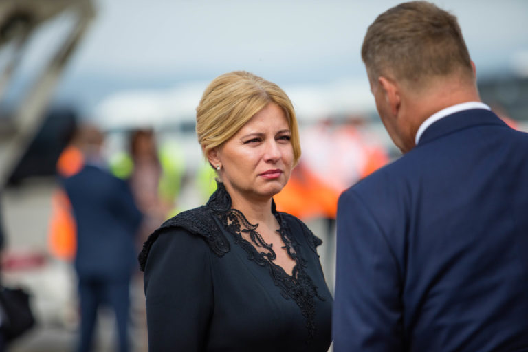 Zľava: Prezidentka SR Zuzana Čaputová a predseda parlamentu Boris Kollár na bratislavskom letisku pred odletom Svätého Otca zo Slovenska. Bratislava, 15. september 2021. Foto: SITA/Jana Birošová
