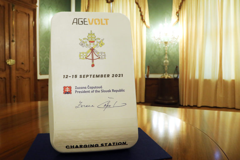 Nabíjacia stanica pre elektromobily, darovaná Svätému Otcovi od prezidentky SR po spoločnom stretnutí v Prezidentskom paláci. Bratislava, 13. september 2021. Foto: SITA/Kancelária prezidentky SR