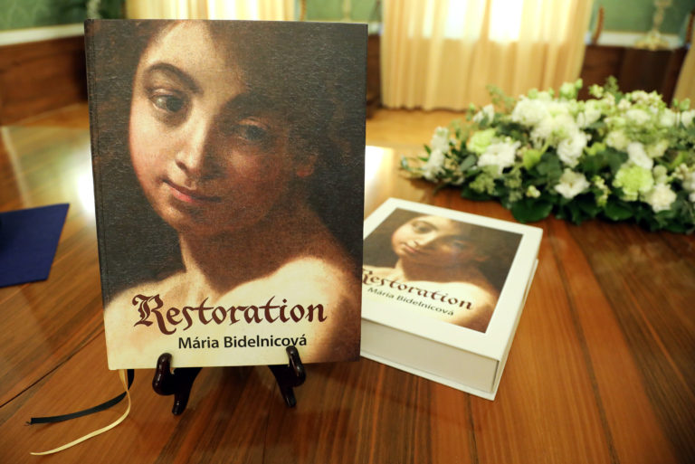 Kniha Reštaurovanie od akademickej maliarky Márie Bidelnicovej, ktorú darovala Svätému Otcovi prezidentka SR po spoločnom stretnutí v Prezidentskom paláci. Bratislava, 13. september 2021. Foto: SITA/Kancelária prezidentky SR